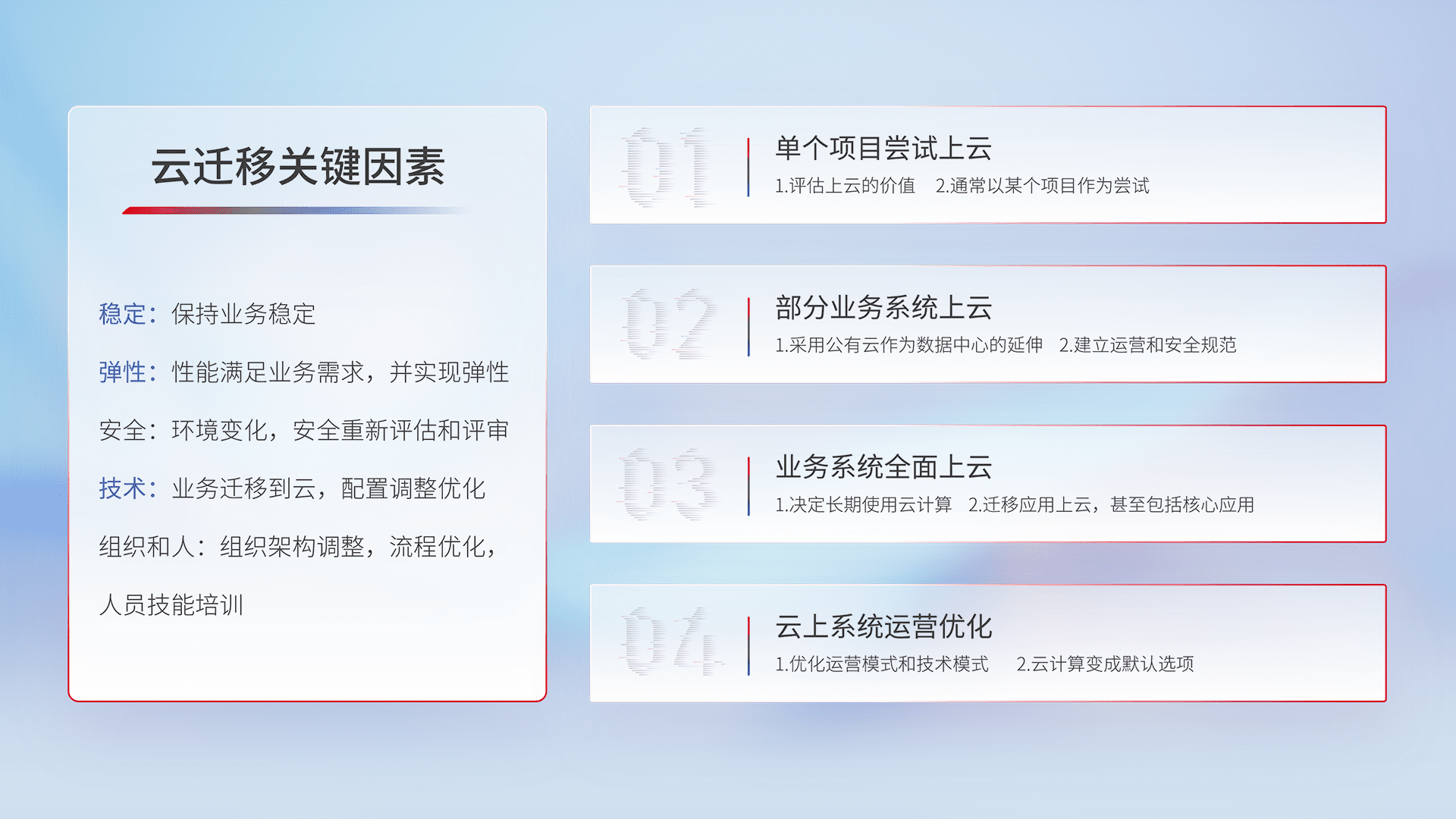结合实际业务,,从规划设计、、、、云平台选型、、云原生改造、、、数据迁移、、、、集成交付,,迁移全过程为客户识别最佳上云路径,,,做好风险识别管理,,,,设计网络架构、、身份权限、、、、安全审计合规、、、操作审计、、日志审计、、、、监控告警策略、、、、多站点容灾设计等,,,对云上基础设施进行整体规划,,提升IT治理水平,,以满足弹性、、、高可用、、高性能的需求。。