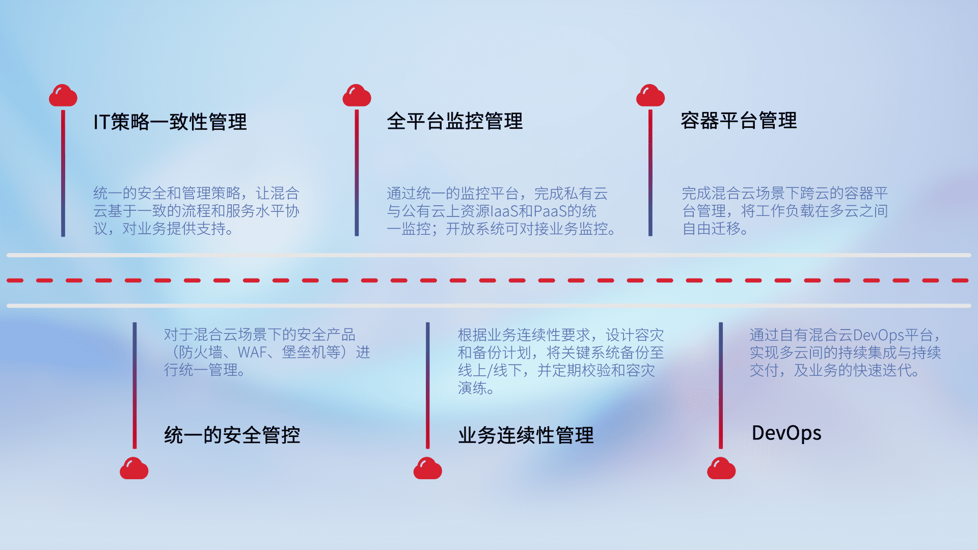 通过多云纳管,,以统一的资源数据模型把客户的云资源进行抽象和封装,,进而实现对多云资源的统一操作,,,保障云资源管理的可靠性、、、、稳定性与可用性。。量身定制化运维内容,,,配置、、开发运维、、补丁管理、、、、备份、、、、监控、、认证和访问管理、、、审计和日常巡检等,,,保障在用云过程中的可靠度,,稳定度以及高可用率。。