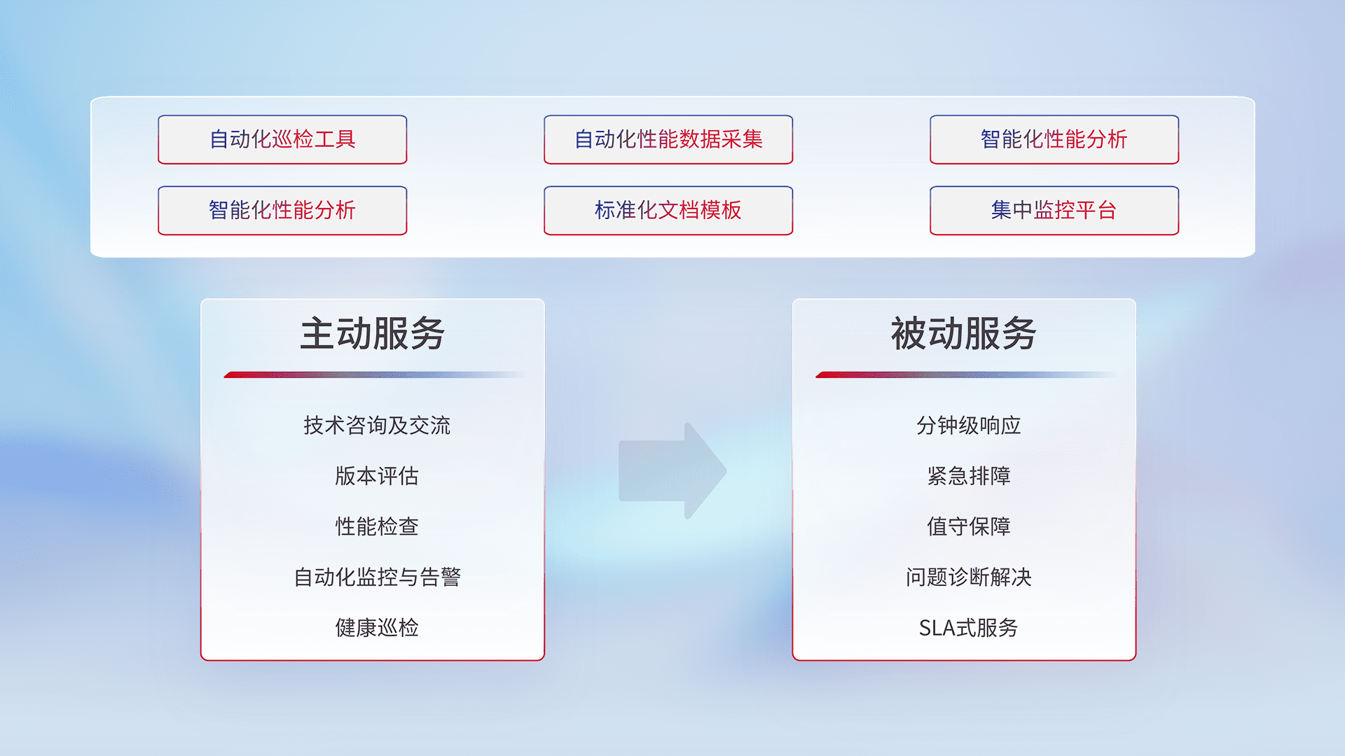 智能化工具和标准化文档,,,保障服务质量,,,提供主动服务(包含技术咨询、、版本评估、、性能检查、、自动化监控与告警、、、健康巡检)和被动服务包含(分钟级响应、、、紧急排障、、值守保障、、、、问题诊断解决、、SLA服务)。。。