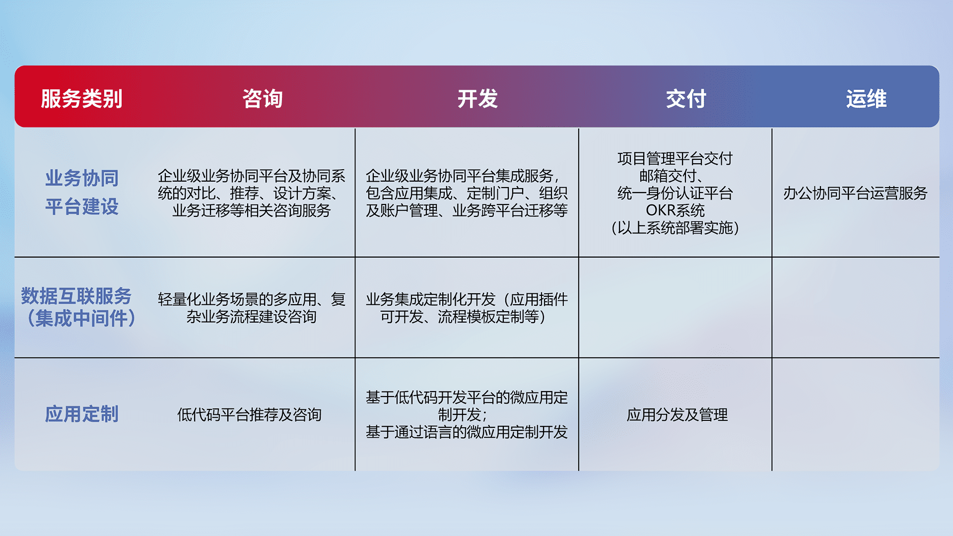 针对钉钉、、企微、、、IDaas等平台级产品提供产品的规划、、、、方案、、、交付、、、定制化开发等服务,,,,实现如统一协同办公、、、智能客户服务、、、、混合会议管理、、、、智能数据查询、、、、等业务场景,,,实现数字化转型。。。